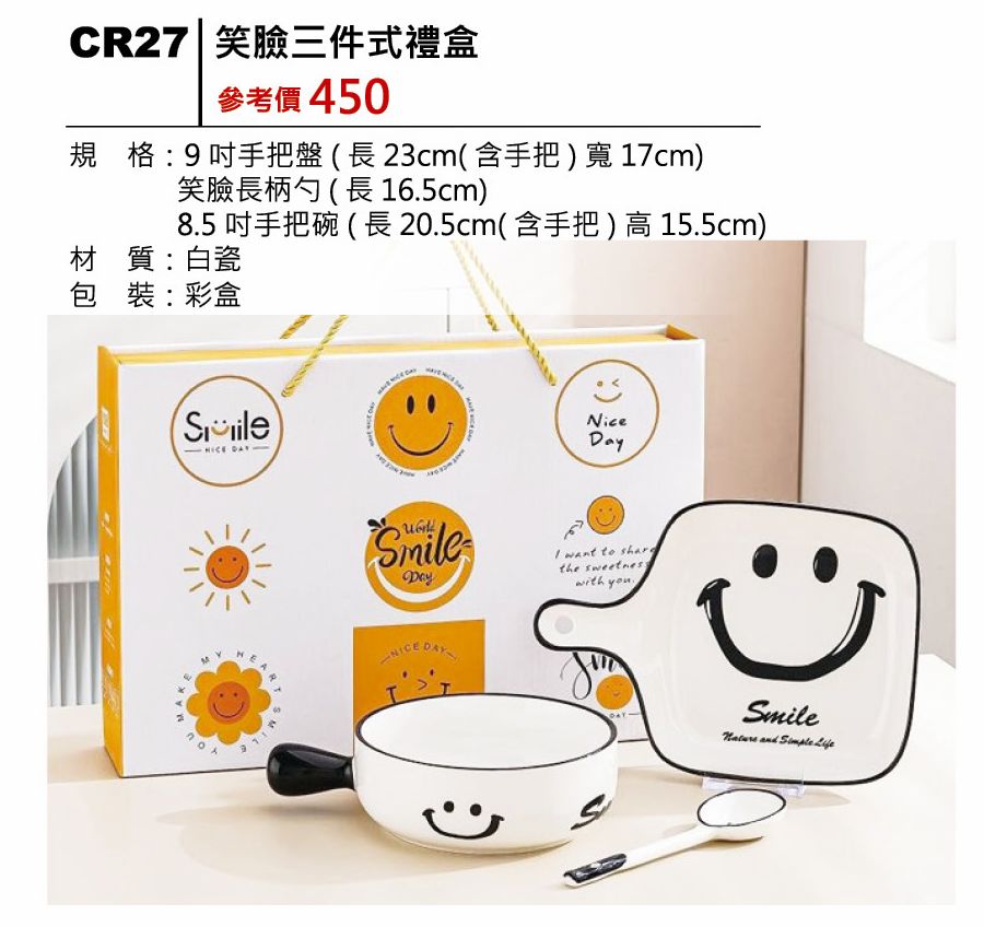1.規格:9 吋手把盤(長 23cm 含手把,寬 17cm)/笑臉長柄勺(長 16.5cm)/8.5 吋手把碗(長 20.5cm 含手把,高 15.5cm)