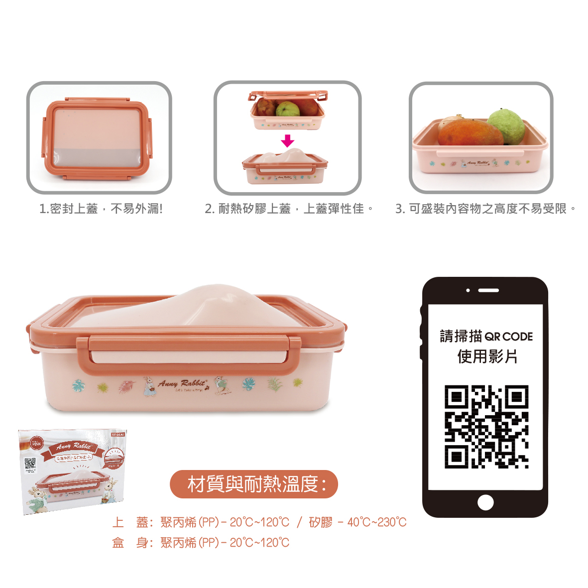 1.材質:上蓋-聚丙烯PP.矽膠/盒身-聚丙烯PP。
