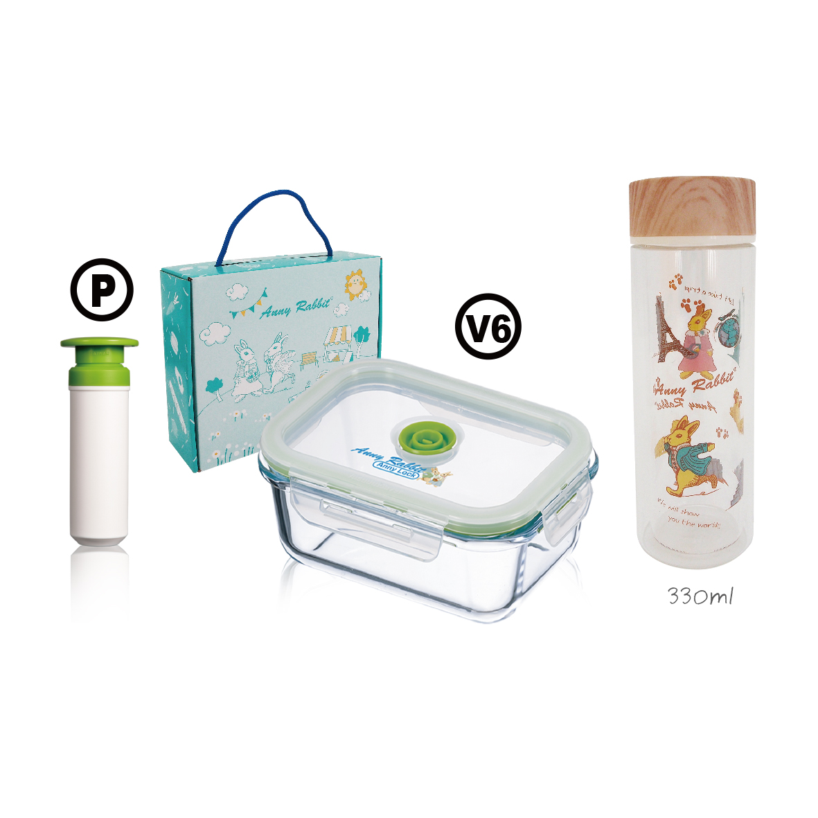 安妮兔真空640ML保鮮組+安妮兔雙層木紋玻璃瓶330ML